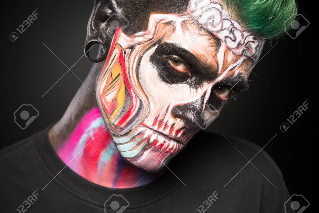 明るいスケルトン化粧の顔をマンします。神秘的な顔アート コンセプト、詳しい顔の絵です。 の写真素材・画像素材 Image 87489618.